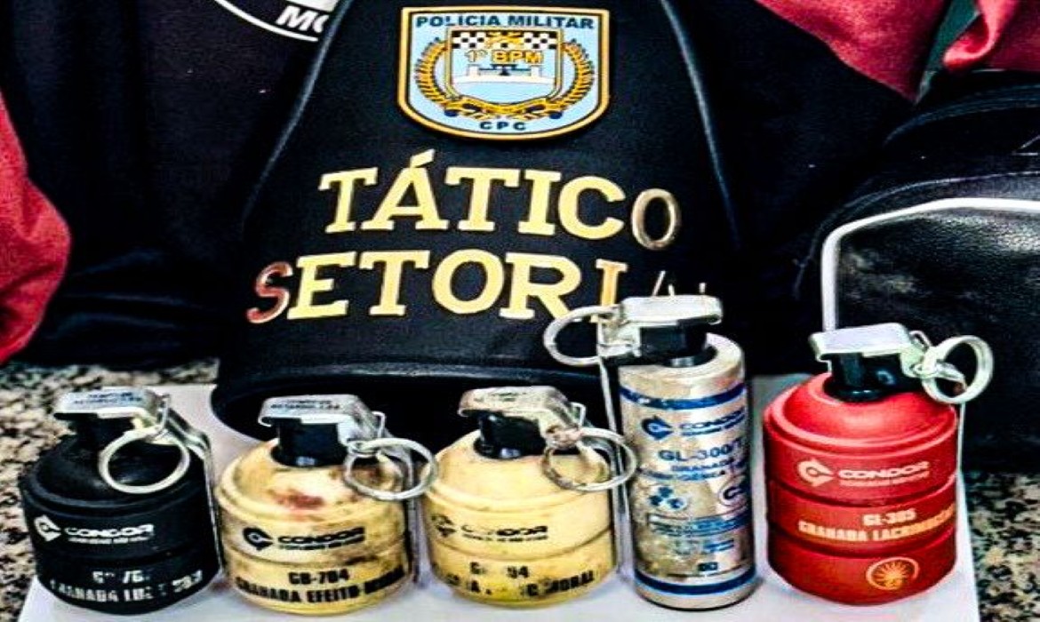 Durante a revista, foram encontrados dois artefatos de efeito moral, uma lacrimogênea tripla e uma granada de luz e som, dentro de uma bolsa.